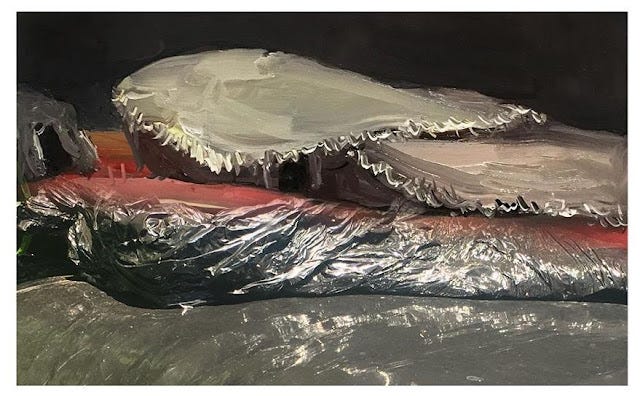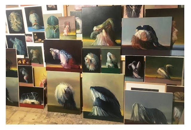 What amazes me is the fact that he has yet to acquire a North American-based art dealer willing to tackle his remarkably fresh take on biomorphic abstraction and give him the kind of sensitively curated theatre setting they so richly deserve. If possible, I hope to make some small contribution to changing that, however, by curating a selection of his works in a suitable museum of dark dreams. This would require a location befitting the magically enchanting places his embodied meanings allow us to travel towards, even if we never actually arrive on their solid shores and instead remain forever at sea with their trenchant and nuanced vistas. And it might only be when we see a whole family portrait of Eskubi’s exotic dis-embodiments, as in a studio installation such as this one, that we can get the true fervour of the feeling his work imparts. Not only does the abyss gaze back at us when we gaze into its depths, or even perhaps its vertiginous heights, but in the case of this unique painter, the abyss also smiles back at us. If, that is, we can bear its metaphysical grin.
