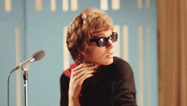 He’s totally right, mostly because that reality often defies belief. As we know, the plot involves a dramatic and charismatic main character who almost accidentally (only a couple of months after arriving in England in ’65) outdistanced the popularity contest with both Paul McCartney and Mick Jagger for a time. The main character becomes a teen idol and heartthrob who has several nervous breakdowns, disappears for decades at a run, comes back occasionally to make an album, does an inordinate amount of drinking, meets strangers in bars who adore him and from whom he runs in panic, and influences the entire course of contemporary music from the shadows.